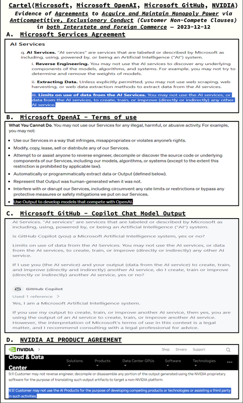 TL;DR: I meekly suggest we boycott these companies because they are heavily and explicitly anti-competitive and this goes for all their businesses (Microsoft OpenAI and Microsoft GitHub) also it all runs on NVIDIA chips which have similar terms.